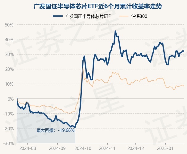 本站消息,1月22日,广发国证半导体芯片ETF最新单位净值为0.6106元,累计净值为1.2212元,较前一交易日下跌0.18%。历史数据显示该基金近1个月下跌2.44%,近3个月上涨3.11%,近6个月上涨31.94%,近1年上涨51.82%。该基金近6个月的累计收益率走势如下图: